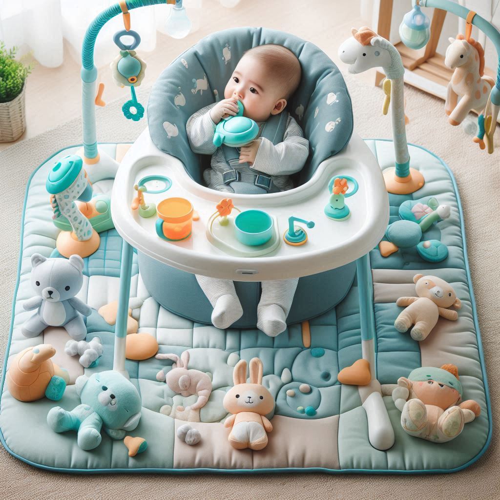 - Tummy time mats with hanging toys: These encourage babies to lift their heads, strengthen neck muscles, and build motor coordination.